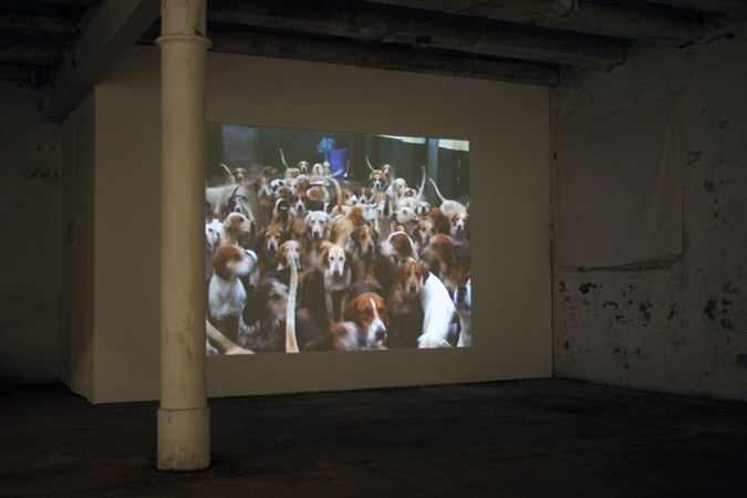 Cultivating material from the English countryside, where Brown spent her childhood, the artist's interest in hunting as sport led to the creation of 38 1/2 Couple, a video work that documents the "hidden lives" of a clan of hounds as they await the next hunt. The presence of the camera, of course - and the artist behind it - imbues the hounds with a self-consciousness and curiosity they would otherwise lack, while the supplemental pieces - a video listing each of the dogs' names and an audio interview with their trainer - further situates these hounds' lives as an extension of a larger human project.