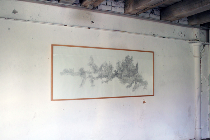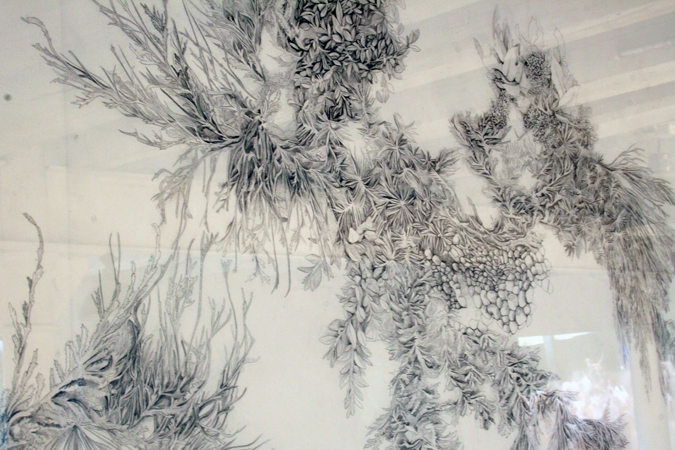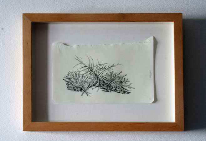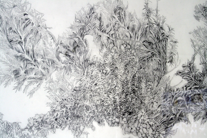 Brown's training as a sculptor emerges at the forefront of her large drawings of conifer trees. The artist takes photographs in the forest of a seemingly infinite hatch of foliage, then "edits" her footage - effectively sculpting the material - into peculiar shapes that are then drawn on paper in painstakingly exquisite detail. Even here, seemingly undisturbed nature is not allowed to rest; rather, it is the artist herself who intervenes, mimicking an act of God through her re-structuring of flora.