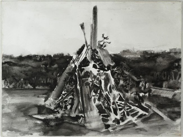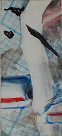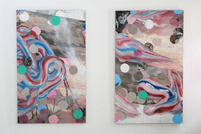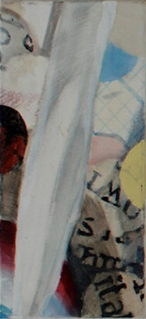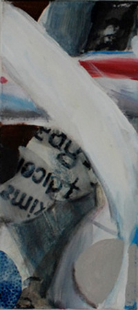 Then there's the toothpaste. A red-white-blue whirligig snaking its way through many of these paintings, Collard mixes paint with actual toothpaste in order to get the chalky effect that smudges its way into the canvas. These paintings form a series, "Zahnderzeitpasta", which refers to the German colloquial expression, "the tooth of time" translatable into English as the ravages of time. In Zahnderzeitpasta 4.1 fragment (2007), the toothpaste takes up the entire background, while we are forced to contend with a decrepit black object, half phallic and half fecal, in the foreground. It takes the eye a minute to recognize this as two burnt matches, tied together by thread to form a cross and stuck into the pile of dental hygiene product, magnified some twenty times. The discordant combination of colors is what endows this painting - a fragment, according to its creator - with its winning combination of brashness and vivacity.