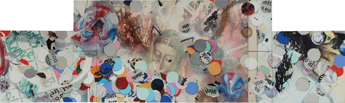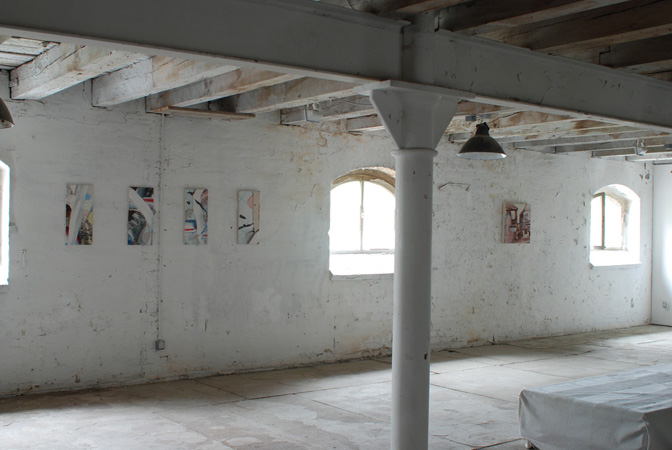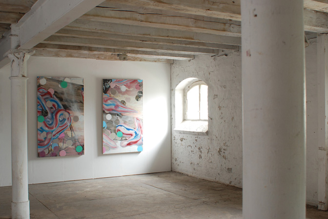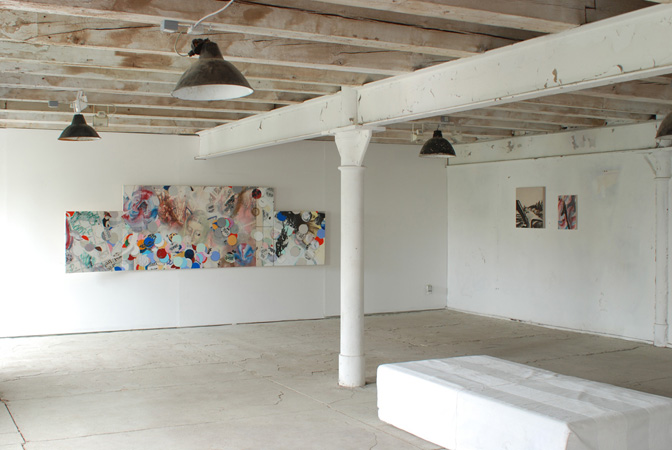 The title, 20:1, refers to the scale shift in the paintings that form the main part of the exhibition. Here, densely layered images give rise to a unique collage technique dictated partially by chance. In the diptych Zahnderzeitpasta Delta Second (2007), for instance, a kitsch postcard image of a sunrise seems to have been sat on top of graph paper, while paper dots from a hole-puncher - each enlarged to the approximate size of a fist - form an integral part of these narratives-as-image, which only someone with a pronounced poetic sensibility could pull off.
