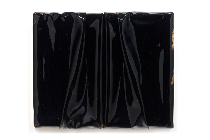 Similarly, the slick surfaces of "Summer" and "April" are at once alluring and repelling. Two sheets of transparent vinyl encase tar and Campho-Phenique, an over-the-counter medical product used for minor scrapes and burns. In contrast to the unromantic and synthetic materials, the titles of the works are reminiscent of women's names and evoke times of year associated with warmth and rebirth. The two pieces thus call to mind notions of balance and bliss and continue the dialogue of duality within the project space.